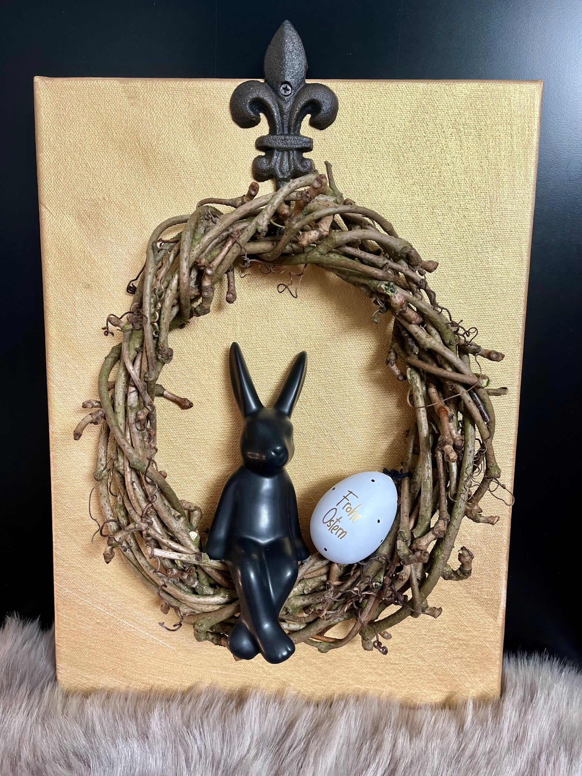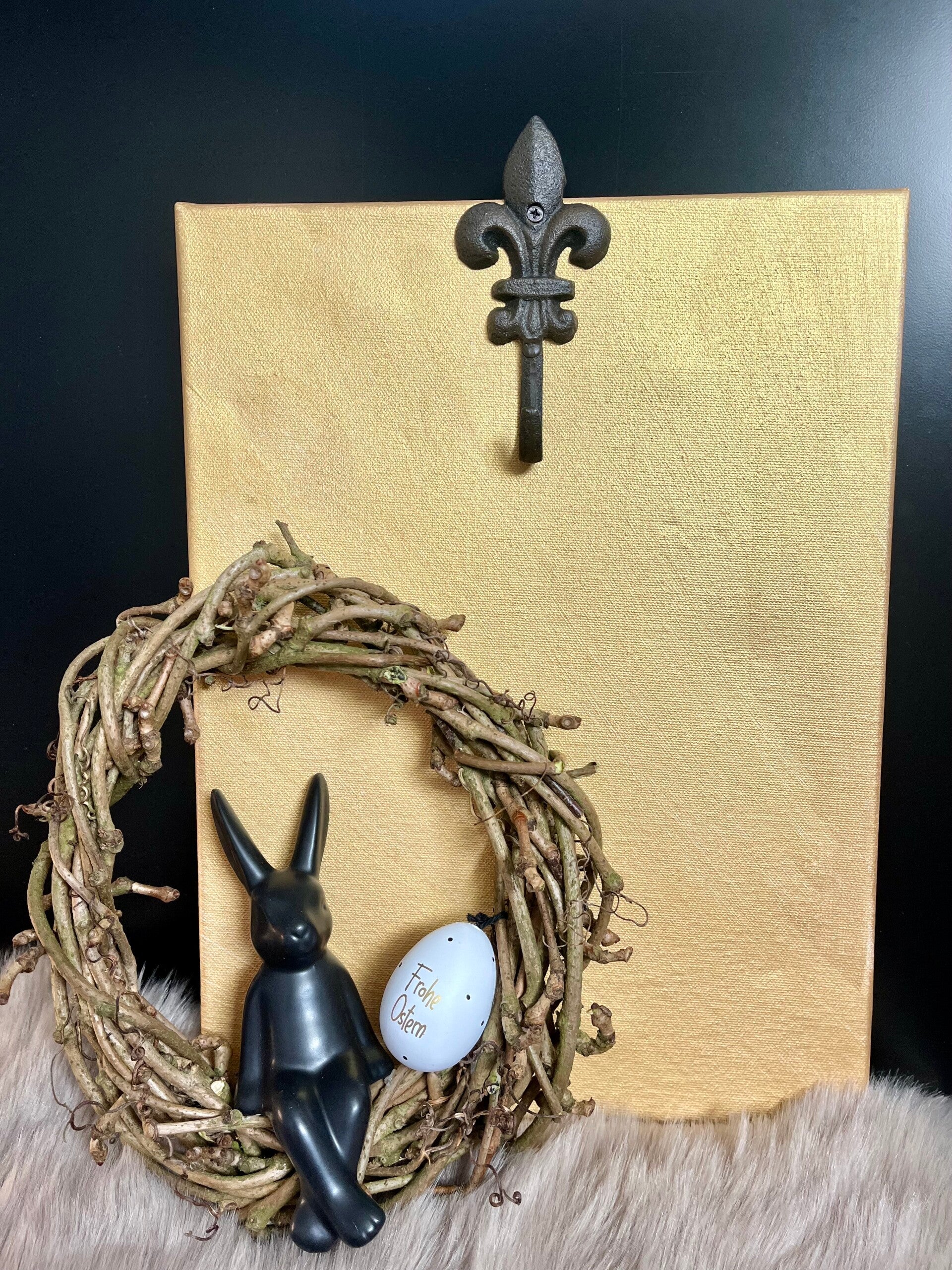 Weidenkranz auf handbemalter goldener Leinwand(40x30cm) mit Gußeisenem Haken(13,5cm), Keramik Osterhase und Ei.