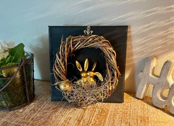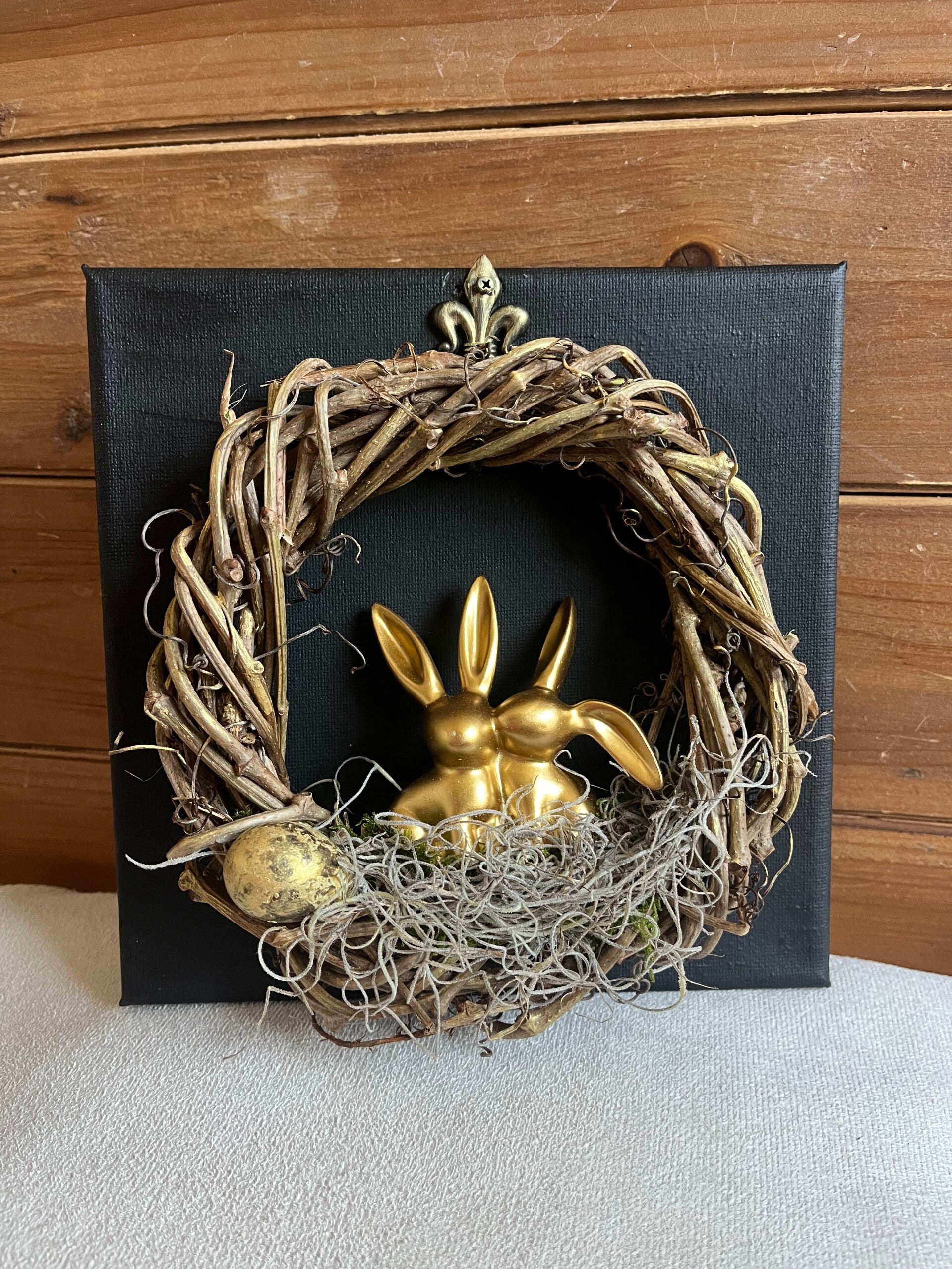 schwarze Leinwand (20x22cm) mit Haken, Weidenkranz mit goldenen Hasen, Moos und Ei.