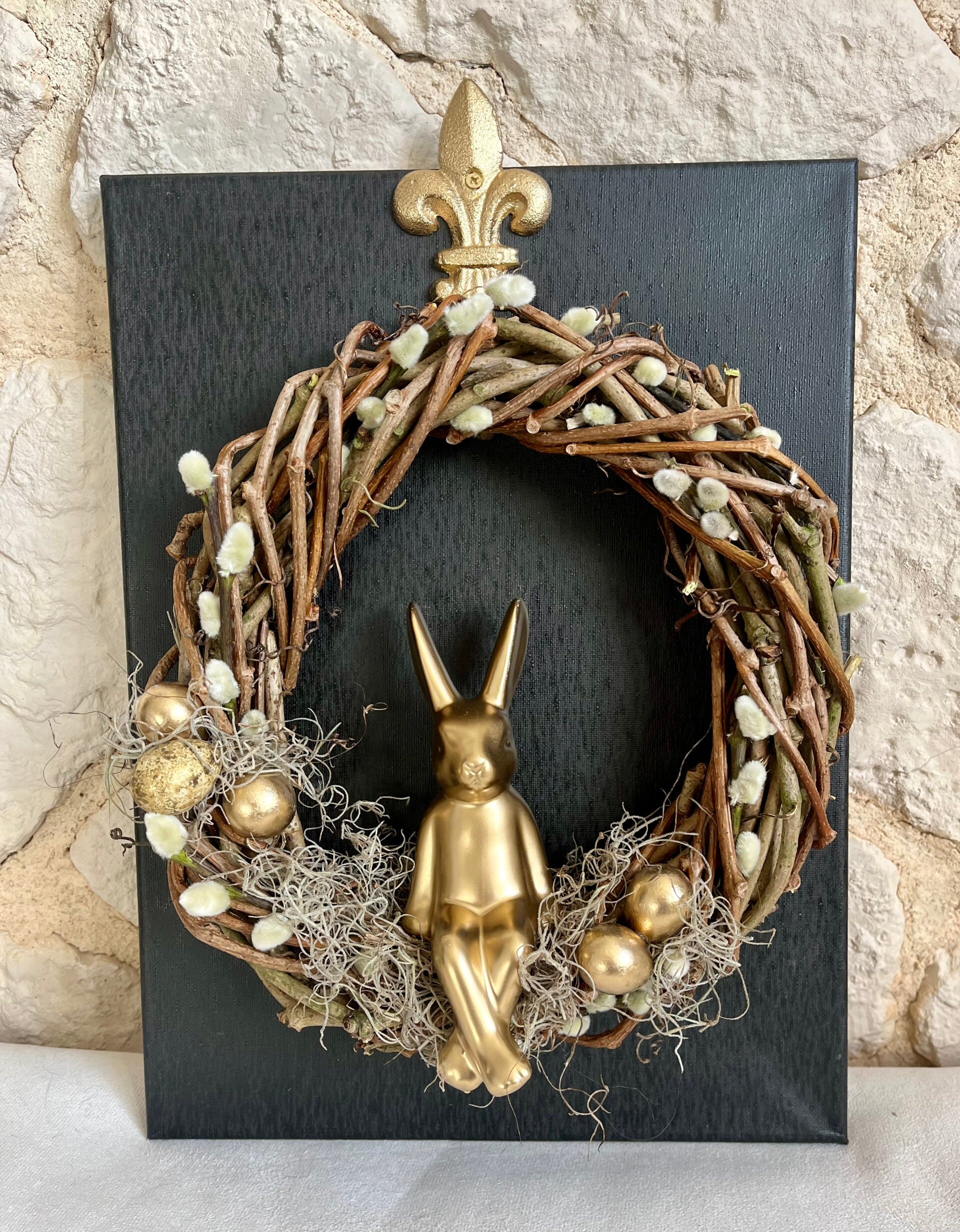 Dekoriert mit goldenem Hase, Weidenkätzchen, Moos und goldenen Wachteleiern.