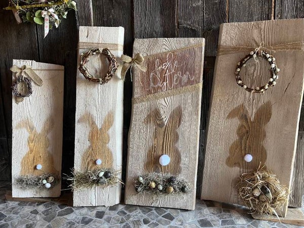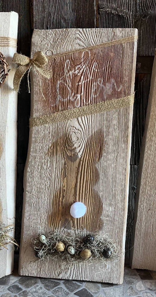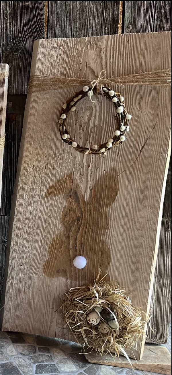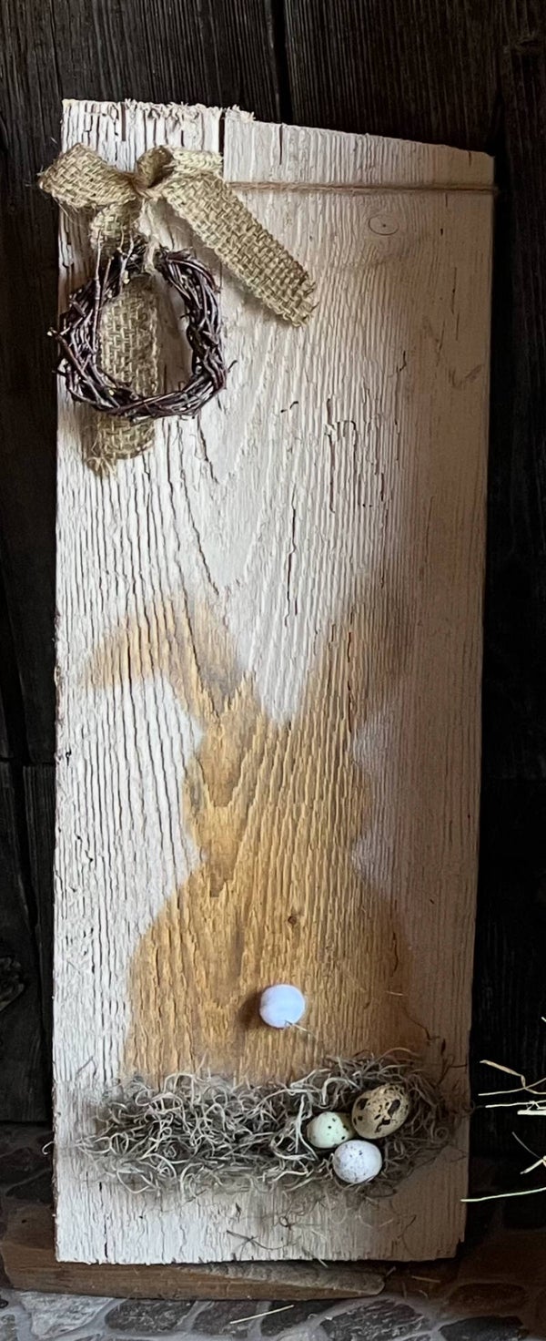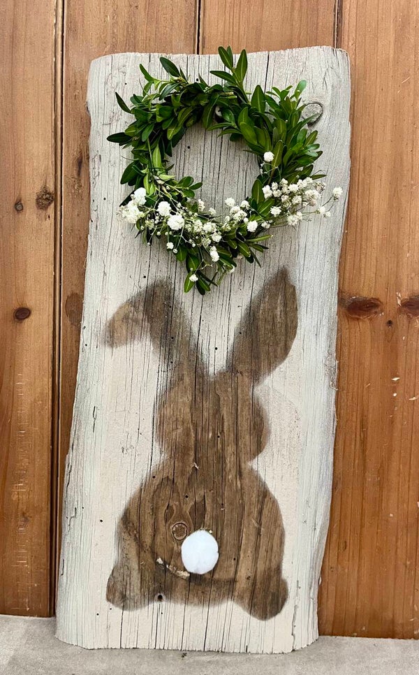 Auf Altholz mit Kreidefarbe gesprüht.