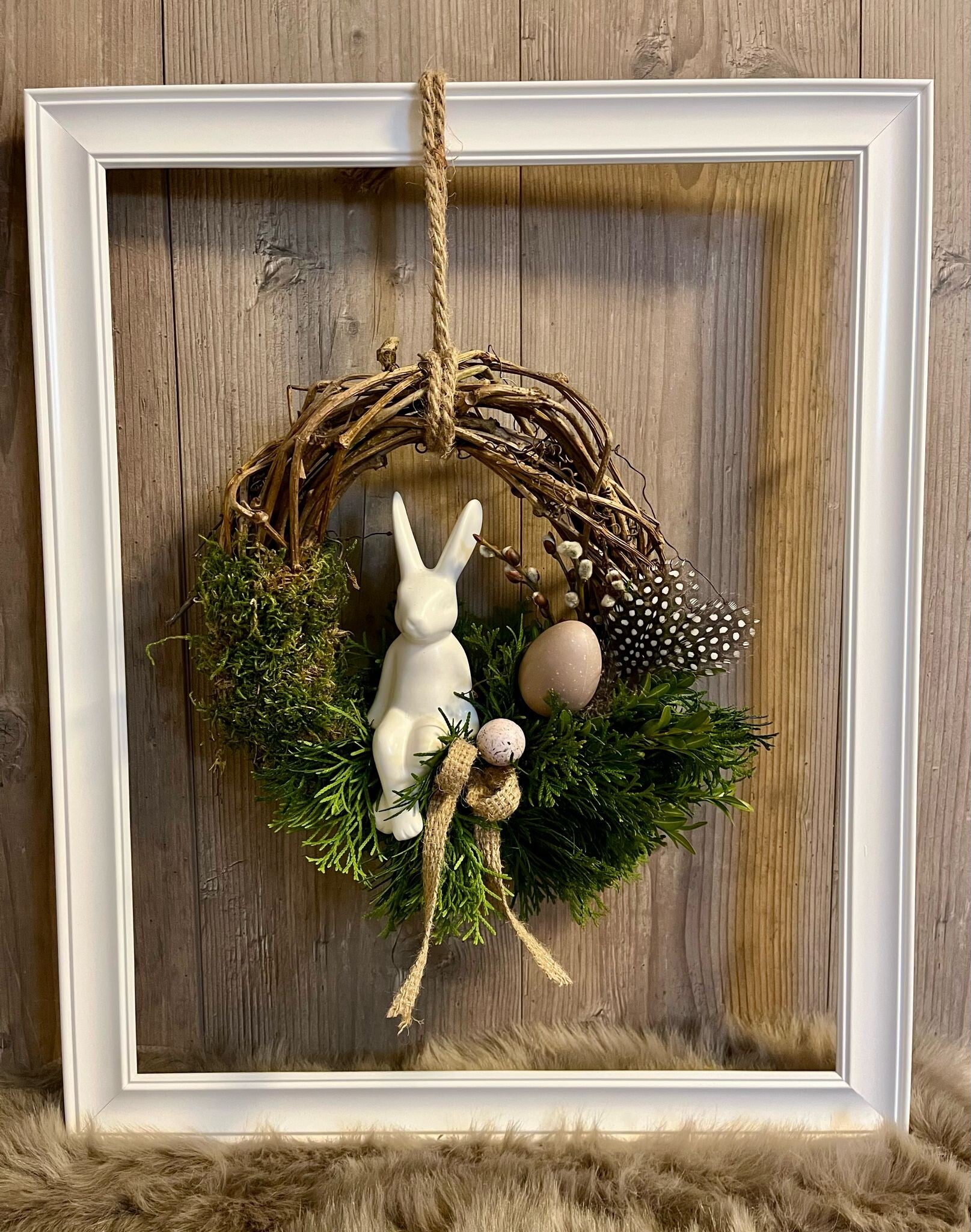 Weidenkranz ø25cm mit Moos, Thuje, Keramikhase und Eier dekoriert.