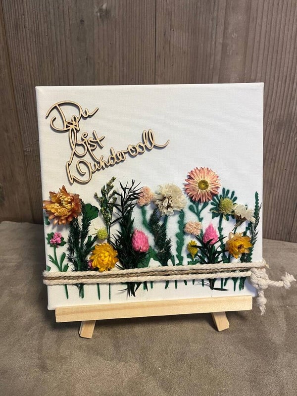 Weiße Leinwand 20x20cm mit Staffelei, dekoriert mit Schriftzug aus Holz.