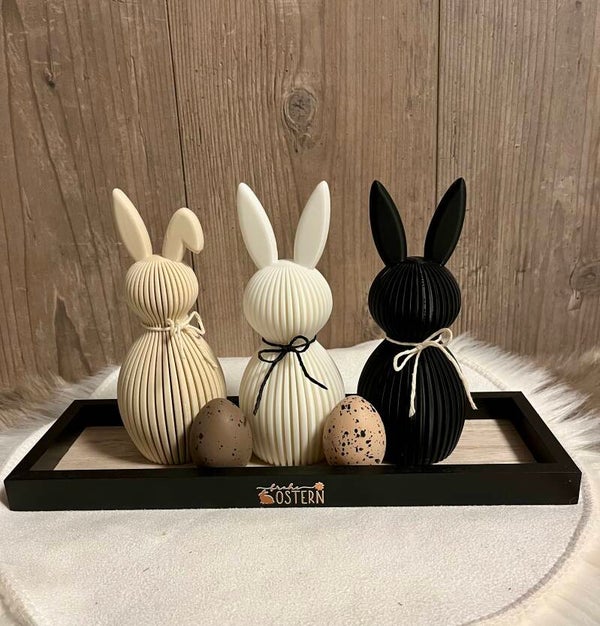 Tablet mit drei unterschiedlichen Hasen (3D-Druck), mit Kunstblumen und Eier dekoriert.