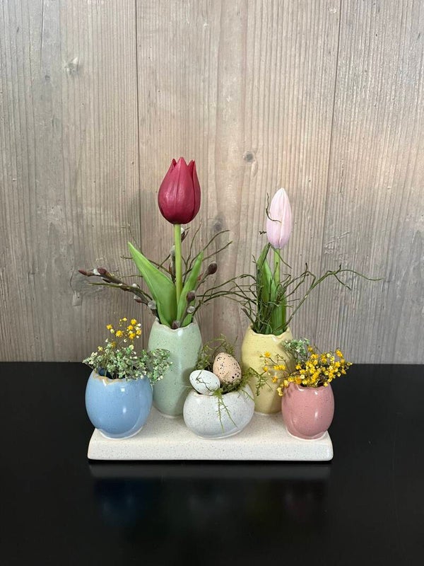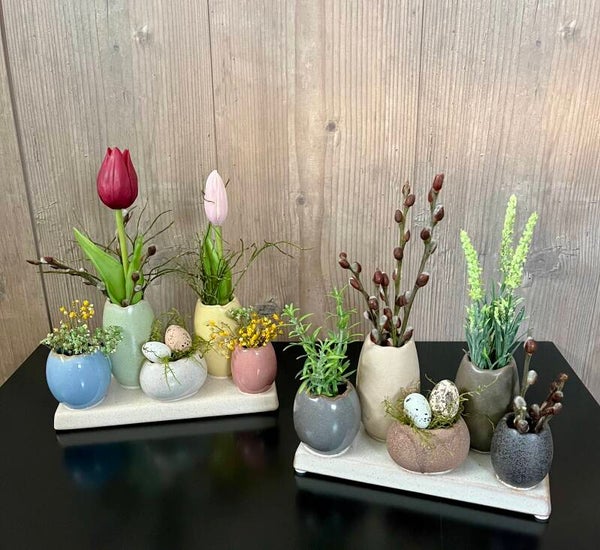Keramikvasen auf Keramikplatte in Eierschalenoptik, dekoriert.